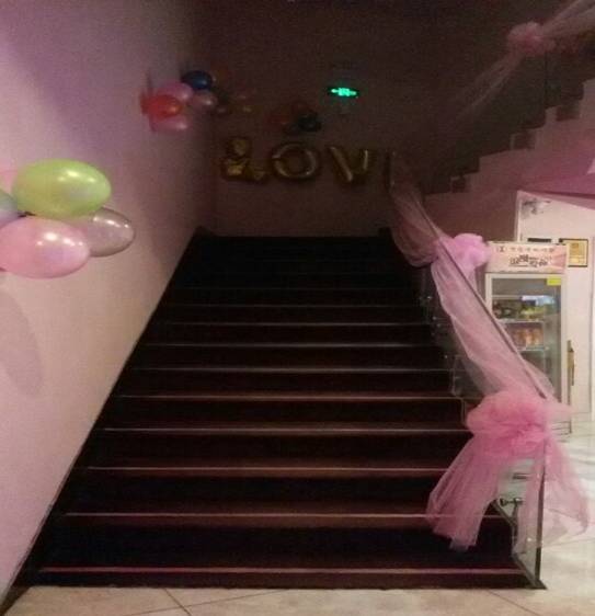 当然,最主要的还是这温馨、浪漫氛围。惹人喜爱的粉色布景,点缀在墙上的气球,以及楼梯拐角处那浓浓的Love(爱意),携手你的另一半走上这爱的楼梯。爱ta一定就要告诉ta!