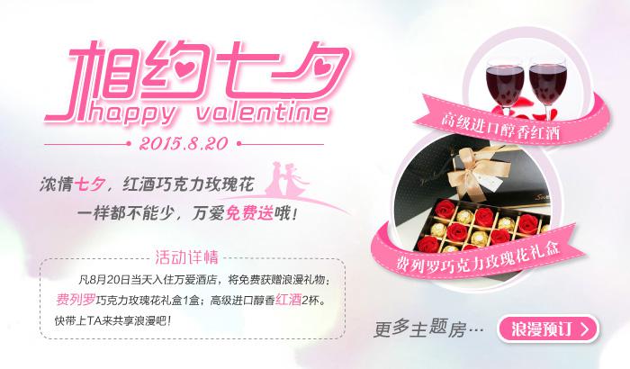 活动内容:凡8月20日当天入住万爱酒店,将免费获赠万爱精心订制的浪漫套餐:费列罗巧克力玫瑰花礼盒1盒+高级进口醇香红酒2杯,小时房客人除外。