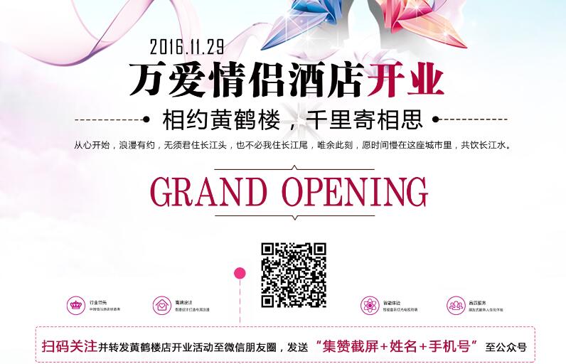 新店新体验,开业首月入住的客人将获得万爱独家提供的2.9折、5.9折、7.9折的优惠,还有机会免费升级为万爱VIP会员。微信搜公众号“万爱情侣酒店”(wanaihotel)回复“黄鹤楼”即可参与活动!转发活动消息,满10个赞即可获得开业折扣码,满20个直接升级为Vip!